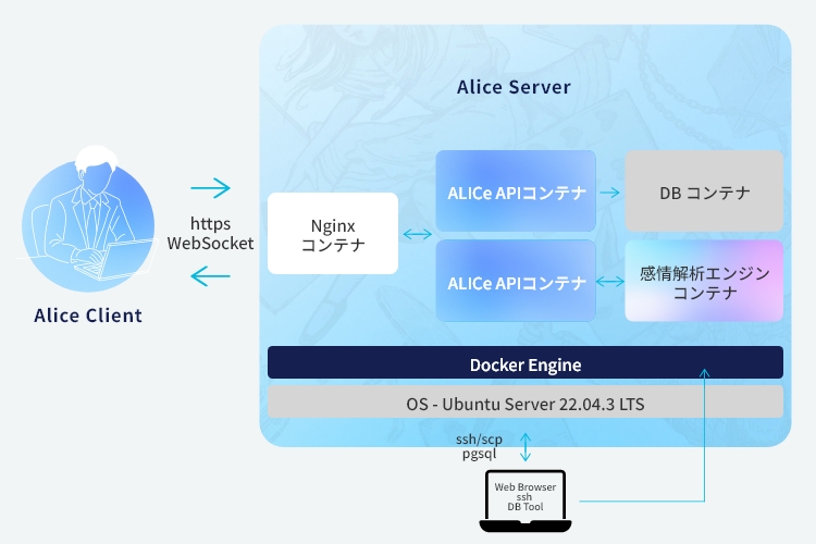 ALICe Server(感情解析エンジン搭載)に音声データをAPI経由で送信することで、複数の感情パラメータと詳細なメタデータがJSON形式で返却されます。ALICe Clientは提供先で構築いただき、サンプルコードや技術マニュアルを通じて導入支援を行います。解析方式はリアルタイム解析(WebSocket)と録音ファイル解析(REST API)に対応しております。