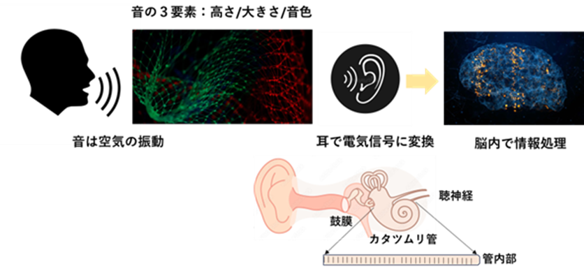 聞き手は空気の微細な振動波形を電気信号に変換し、神経を経由して脳に送られます。