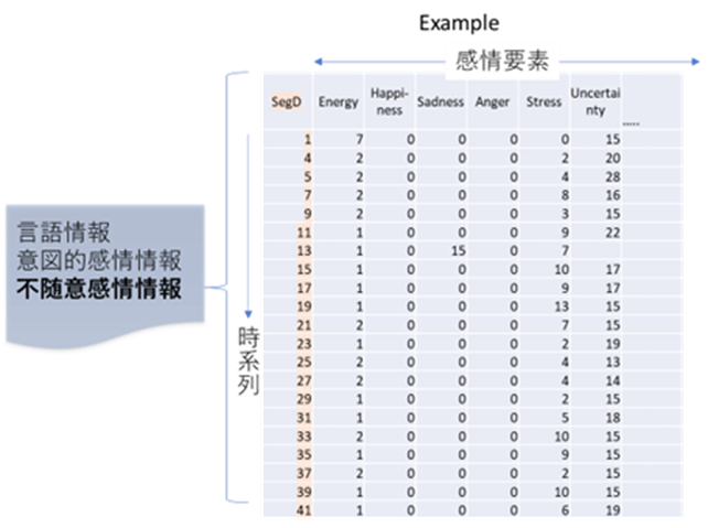 感情状態は時系列的に変化しますから、図に示すように、約2秒毎の感情要素の値を列に時刻(2秒毎)を、感情要素を行にした行列形式で出力します。