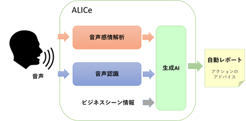 これは音声認識機能の出力と音声感情解析ソフトの出力を、ビジネスシーン情報とともにChatGPTやGeminiなどの生成AIに入力することにより行います。