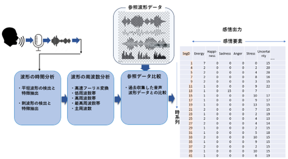 時間分析と周波数分析に加え、これらの収集データと参照することにより、最終的に入力音声波形にどのような感情要素がどの程度含まれているかを計算します。