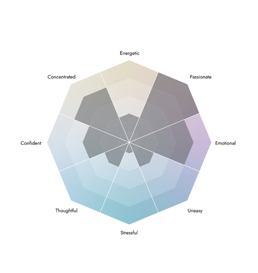話者の全般的な感情状態を示すもので、「エネルギー」「熱意」「情緒」「不安」「ストレス」「思慮」「自信」「集中」を感情ダイヤモンドとして簡潔に表現したものです。