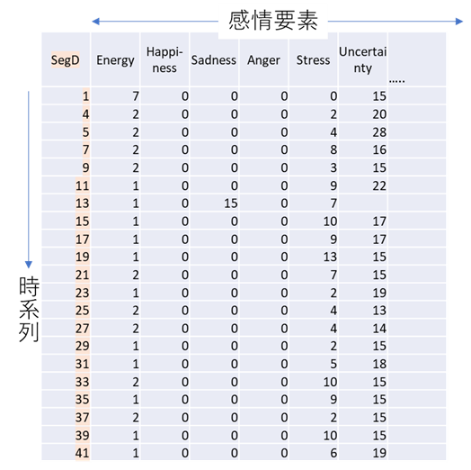 感情状態は時系列的に変化しますから、約2秒毎の感情要素の値を、時刻を列に、感情要素を行にした行列形式で出力します。