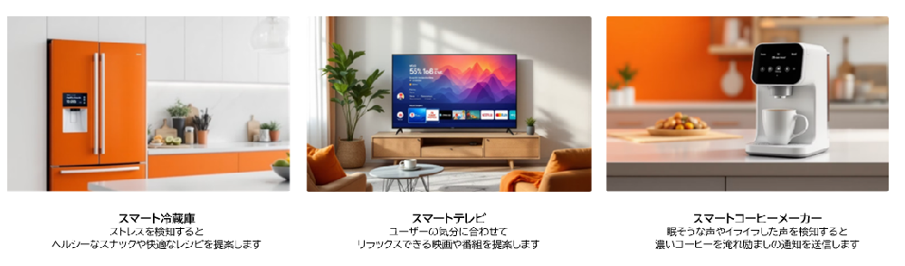 たとえば冷蔵庫ですがストレスを検知すると、ヘルシーなスナックや快適なレシピを提案する、スマートテレビならリラックスできる映画や番組を提案します。