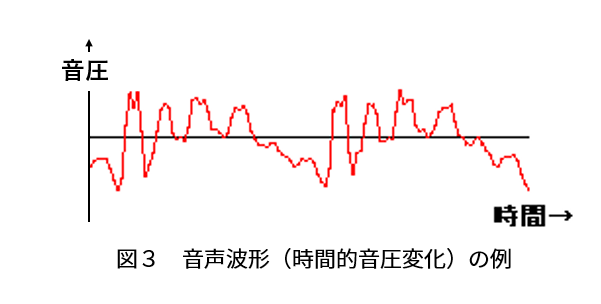 波形にはいくつかの種類があるのですが、横軸に時間をとり、縦軸に空気の圧力(音圧あるいはマイクロフォンの出力電圧)をとって図示したものを図3に示します。