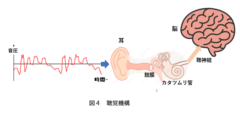 図4に示すように空気の振動は鼓膜を振動させ、その振動情報は耳の中にある小さな骨(耳小骨)により梃子の原理で増幅されてカタツムリ管に伝わります。
