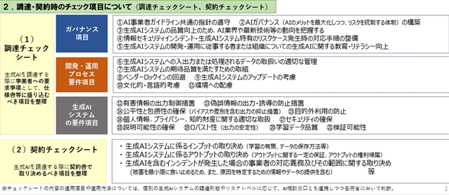 AIシステムの品質、セキュリティ、倫理的配慮(有害・差別的コンテンツの排除など)、個人情報の取り扱いといった観点から、調達時に確認すべき項目を「調達チェックシート」「契約チェックシート」として具体的に提示しています。
